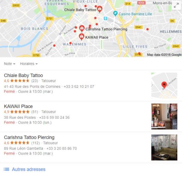 Voyez ci-dessous ce que cela peut donner comme résultat avec la recherche suivante effectuée ce jour : « tatoueur Lille ». En général, seuls les 3 premiers tatoueurs sont affichés de cette façon. Alors imaginez l?impact sur votre activité !