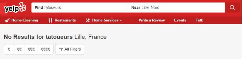 Il faut bien le dire le site Yelp n?est pas très utilisé en France dans le domaine du tatouage comme le montre la copie d?écran ci-dessous. Soyez toutefois parmi les premiers à utiliser cette opportunité, cela améliorera grandement votre référencement et c?est bien la chose la plus importante.