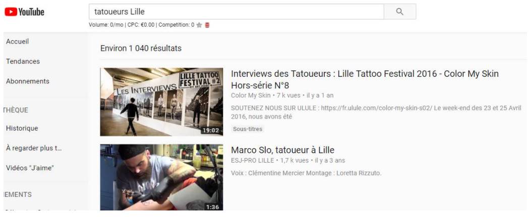 Voyez dans la capture ci-dessous ce que cela donne avec la même recherche « tatoueur Lille » sur YouTube : 1.040 résultats ! Pas moins. Alors, il faut vraiment s?y connaitre pour se positionner dans les premières places.