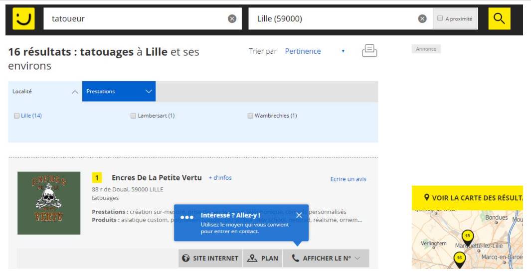 D'autres sites d?annonces en ligne fonctionnent bien pour la promotion de votre boutique. Vous pouvez utiliser les petites annonces locales car ces petites annonces sont généralement gratuites ou peu coûteuses pour être répertoriées. Vous pouvez commencer avec l?incontournable annuaire des Pages Jaunes (voir la capture d?écran pour « tatoueur Lille ». Faites vos recherches sur internet pour découvrir plus d?annuaires, qu?ils soient locaux, de portée nationale ou dédiés au tatouage. Ensuite, sélectionnez quelques annuaires qui ont beaucoup de recherches mensuelles. Et qui rentrent dans votre budget.